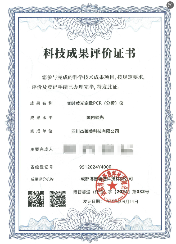 四川杰萊美科技有限公司(JLM)自主研發的實時熒光定量PCR儀,正式完成科技成果評價,經四川省科技廳認證,技術水平達到國內領先水平!