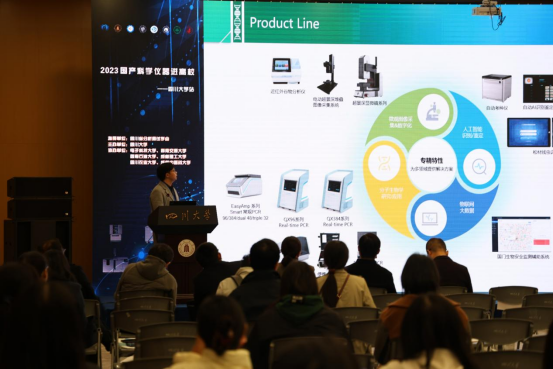 ??下午,杰萊美公司市場(chǎng)部劉育杭經(jīng)理在報(bào)告廳就杰萊美科研級(jí)熒光定量PCR儀的產(chǎn)品定義、設(shè)計(jì)理念以及如何將功能和科研需求相匹配的主題做了發(fā)言。他介紹了杰萊美科技熒光定量PCR儀的獨(dú)特優(yōu)勢(shì),針對(duì)該產(chǎn)品的關(guān)鍵功能進(jìn)行了深入的講解。
