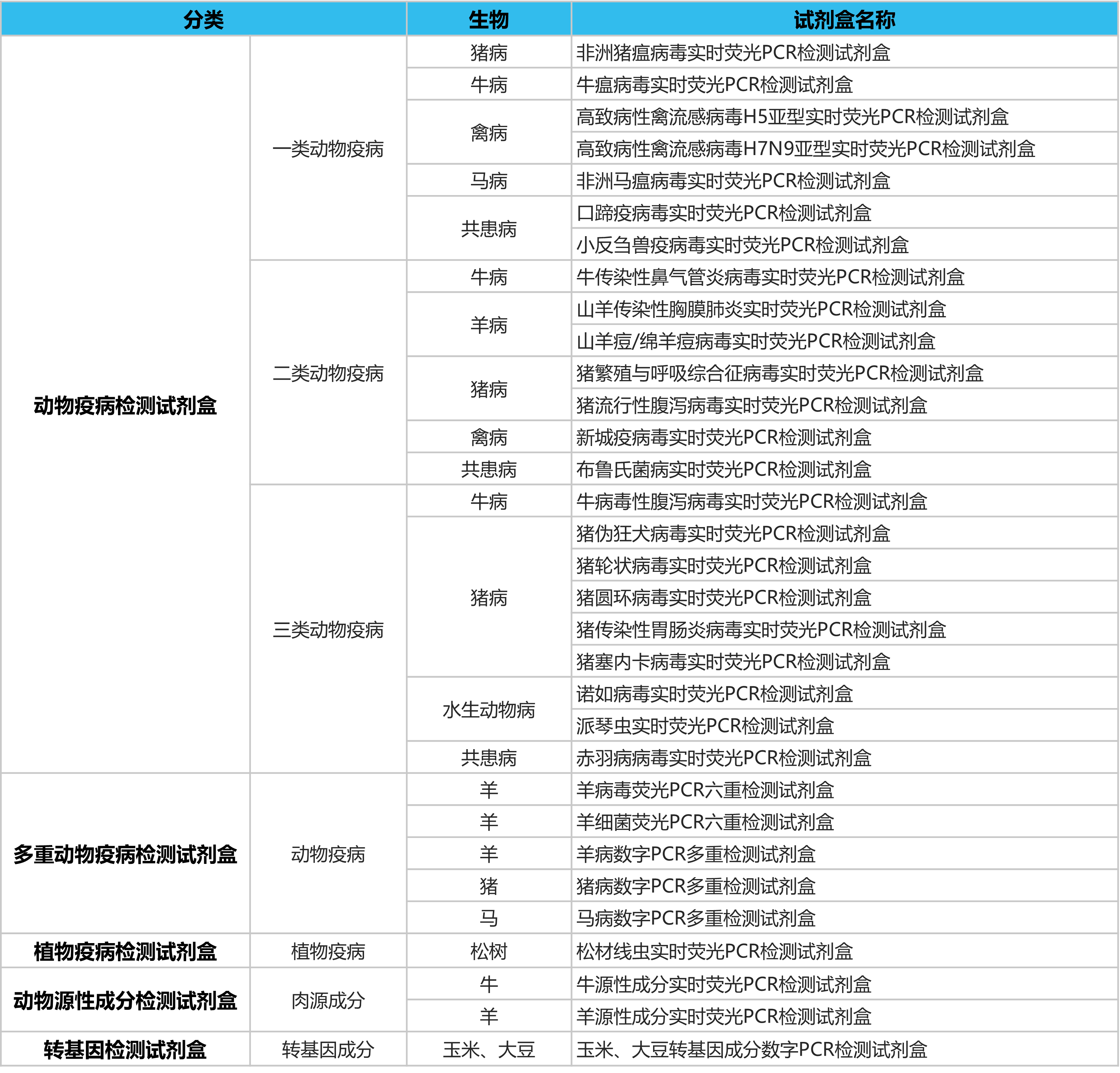 動植物疫病檢測試劑盒,包含動物疫病檢測試劑盒、多重動物疫病檢測試劑盒、植物疫病檢測試劑盒、動物源性成分檢測試劑盒、轉基因檢測試劑盒。